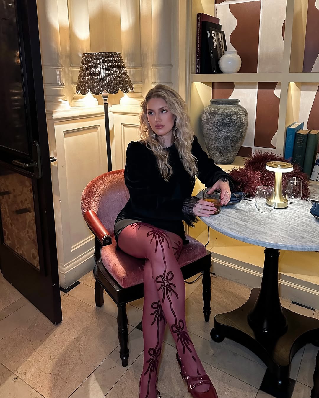 Moody and elegant, this look pairs a simple black long-sleeve top with statement tights featuring delicate bow details running down the legs. Burgundy heels echo the rich tones of the tights, creating a cohesive and festive color palette. Styled in a softly lit setting, the outfit feels polished, dramatic, and perfect for an intimate holiday party atmosphere.