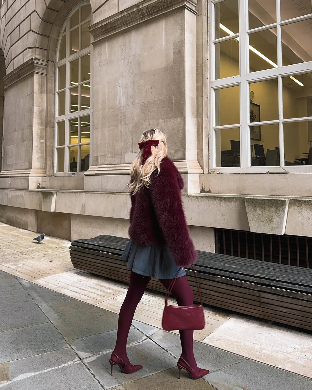 Rich burgundy tones set a moody holiday vibe, pairing a plush faux fur jacket with a simple dark mini skirt for balance. Matching tights, pointed heels, and a sleek shoulder bag create a cohesive look, while a velvet hair bow adds a subtle festive touch. The overall feel is polished, seasonal, and effortlessly chic.