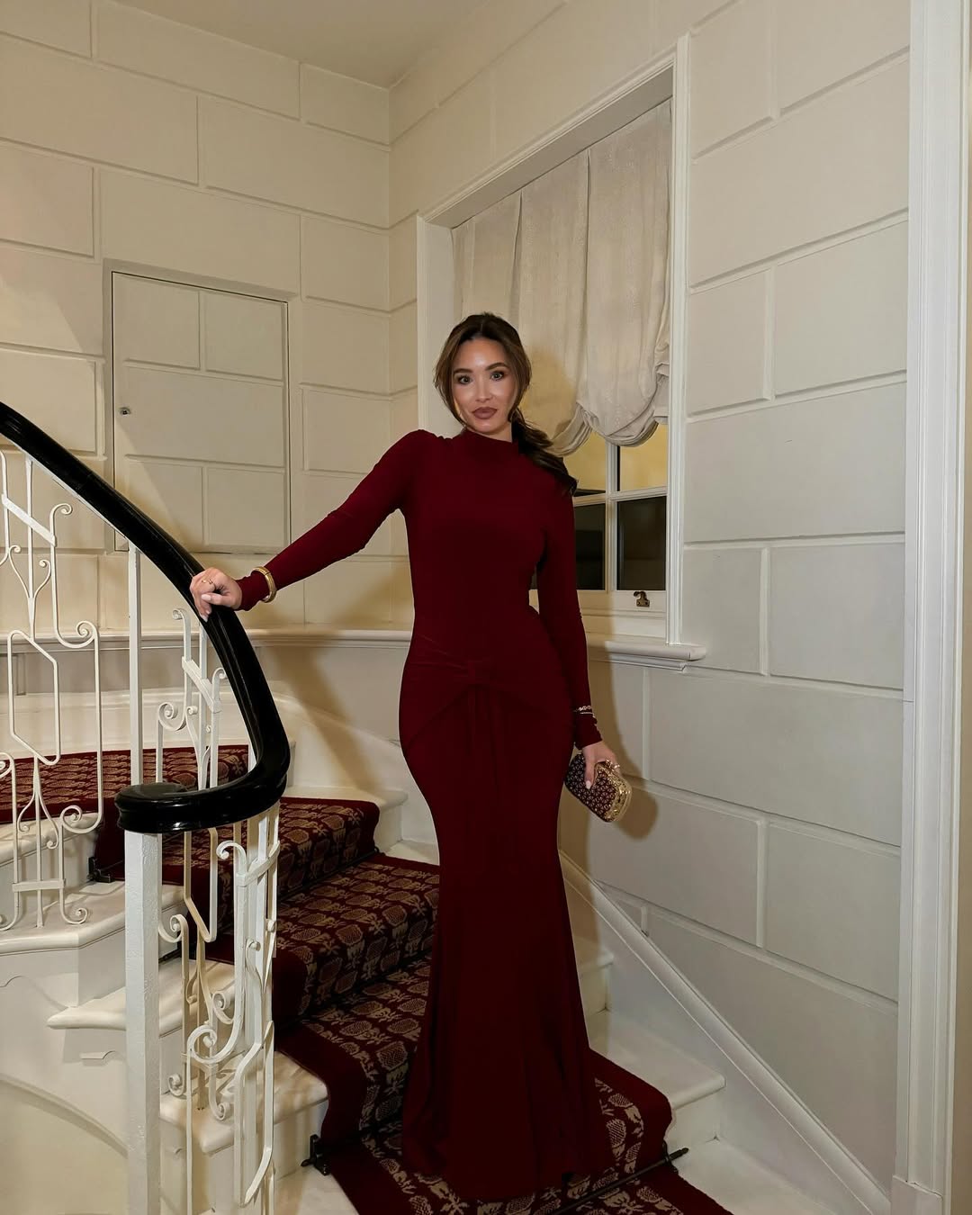 Clean lines and a rich burgundy tone give this long-sleeve maxi dress a timeless, elegant presence. The fitted silhouette creates a sleek, refined look, complemented by minimal gold accessories and a subtle clutch. Styled in a classic setting, the outfit feels sophisticated, understated, and perfect for a formal holiday celebration