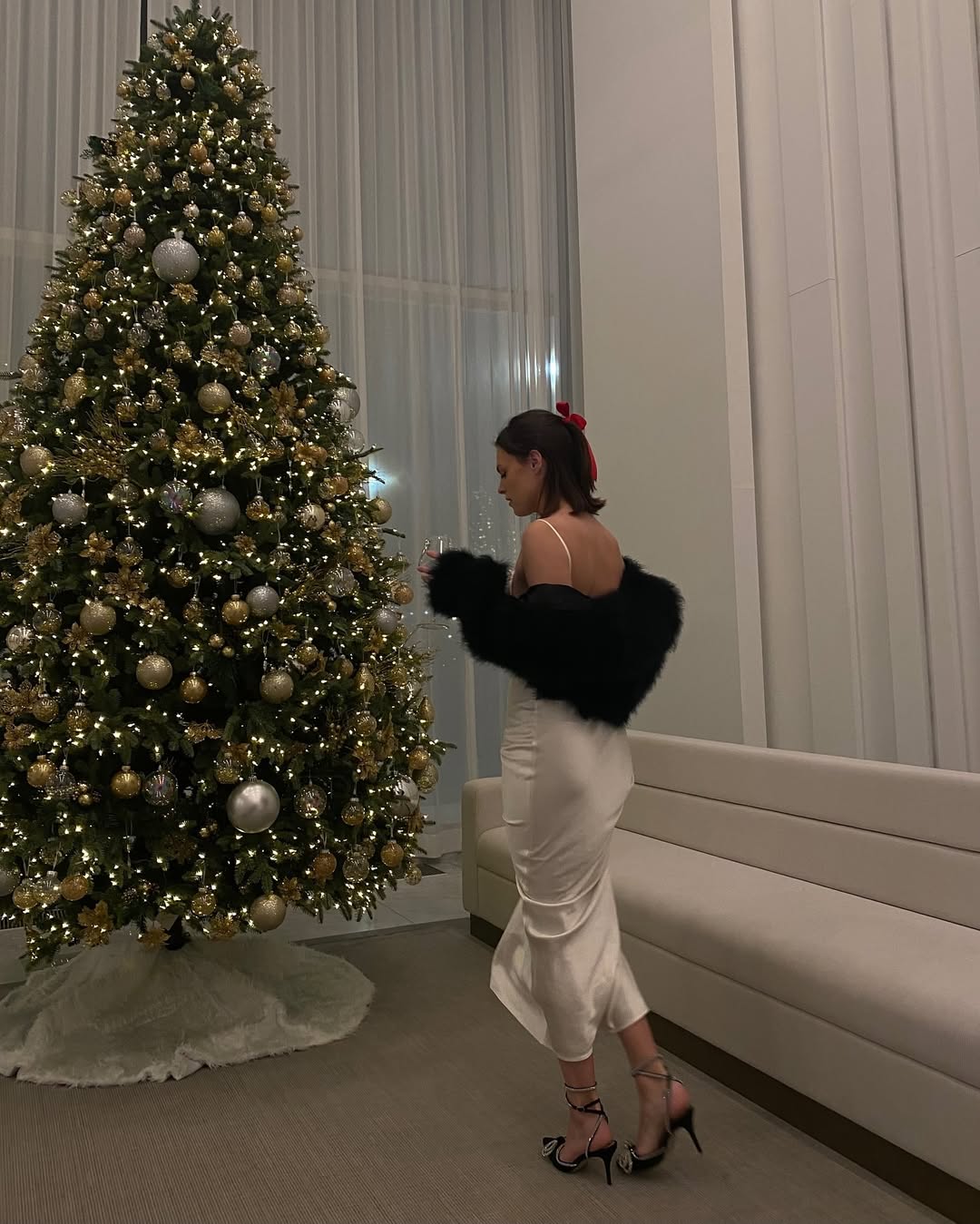 Shimmering sequins bring instant holiday glamour to this slip dress, catching the light with every movement. The deep burgundy faux fur coat adds richness and warmth, creating a luxe contrast against the sparkle. Finished with sheer tights and minimal accessories, the look feels intimate, sophisticated, and effortlessly party-ready.