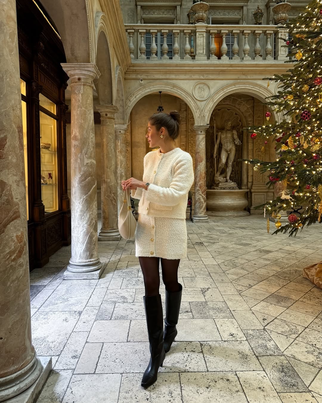 Classic and refined, this cream tweed jacket and matching mini skirt create a timeless holiday look. Gold buttons add a subtle touch of elegance, while black tights and knee-high boots bring a modern contrast. Finished with a structured mini handbag, the outfit feels polished, festive, and effortlessly chic.