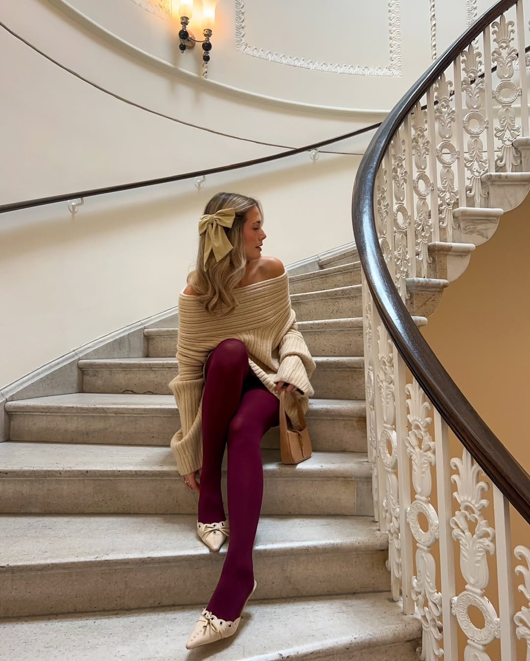 Soft textures take center stage with a slouchy cream off-the-shoulder sweater dress styled for an effortlessly cozy feel. Rich burgundy tights add a festive pop of color, paired with pointed cream flats for a polished finish. Subtle details like the oversized hair bow and compact handbag keep the look charming and holiday-appropriate without feeling overdone.