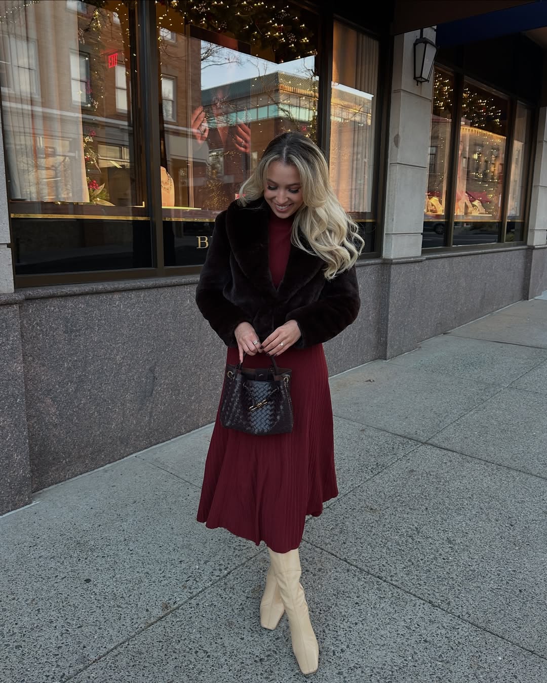 A flowing burgundy midi dress sets an elegant, seasonal tone with its rich color and soft movement. Layered with a dark faux fur jacket, the look feels warm and refined, while neutral knee-high boots add balance. Finished with a structured handbag, the outfit captures a polished and cozy holiday party style.